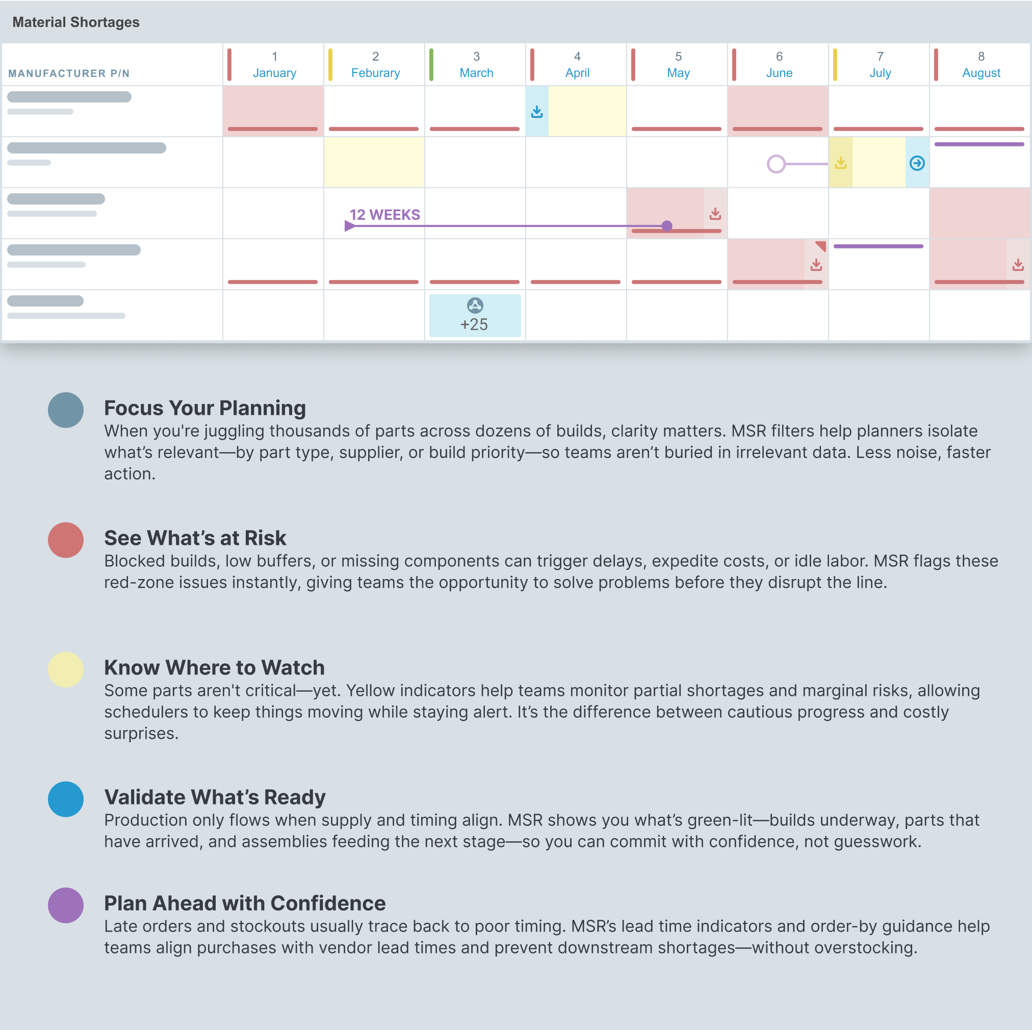 Traditional MRP systems hide this complexity behind overnight batch runs or outdated static reports. Aligni’s MSR gives you live, granular visibility into what’s missing, when it’s needed, and what action to take next—so your team can move fast and stay in control.